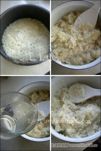 5.分次加入200克凉开水,目的一是降温,二是增加出酒率。每次加入水,都要让糯米充分吸收。加入全部水糯米饭不能成稀糊状,此步骤可以根据经验多加或者少加水。