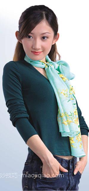 花色图案简单的丝巾,搭配清爽利落的V领线衫,再加上铅笔裙和丽人小皮鞋,既有女人的斯文又有女生的可爱,绝对成为办公室里的人气美女。