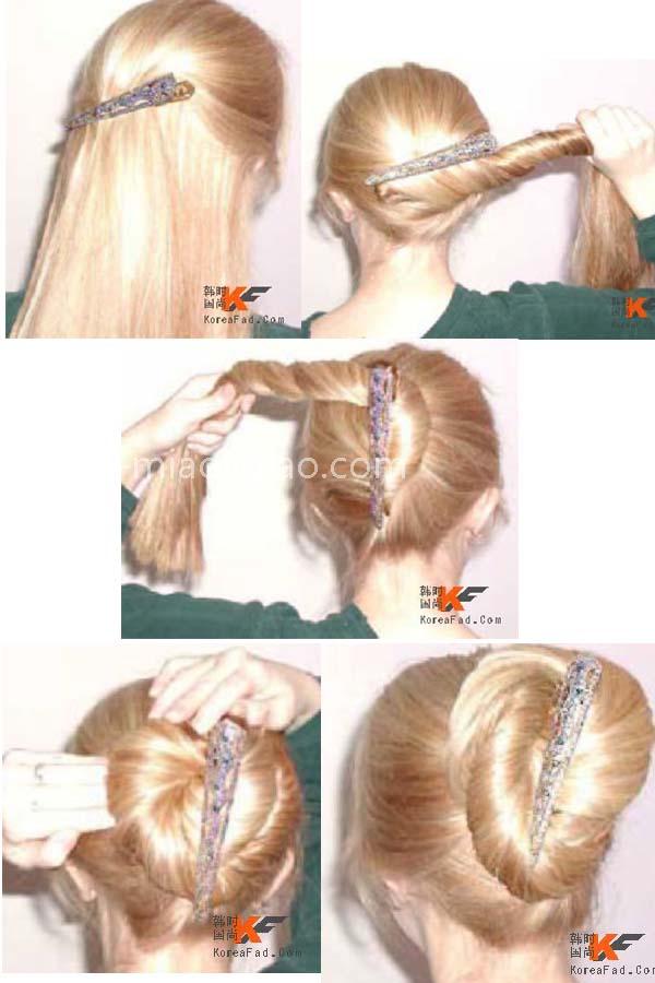 1. 将头发挑一束在中间,用鸭嘴夹夹住 2. 将所有的头发拧紧,顺时针放向旋转至紧 3. 旋紧后的头发逆时针放向绕到鸭嘴夹上 4. 头发绕完鸭嘴夹,将发尾塞到里面,如果MM 头发多,要用一个小发卡固定 5. 成品