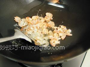 4 锅内加2汤匙油烧热,倒入虾仁炒30秒,直至虾仁颜色微红,然后捞起待用。