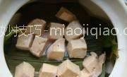 取一能密封的容器,垫上稻草(我木有找到稻草,就地取材用了端午节剩下的粽叶哈),将沥干水份的豆腐切成小方块,均匀地码在上面。