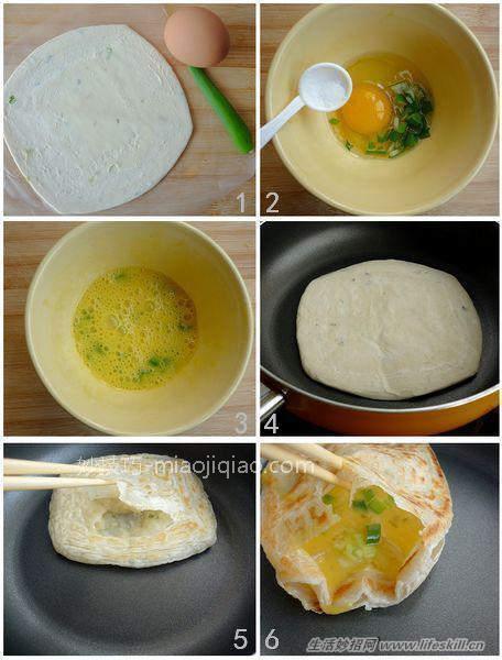 1.鸡蛋磕入碗中,放入切碎的葱叶,再加入一点点的盐。2. 将混合的蛋液搅拌均匀.3.冰箱里取出一片葱油味的飞饼,无需解冻,放进平锅小火煎,也不要放油,飞饼自带油份。
