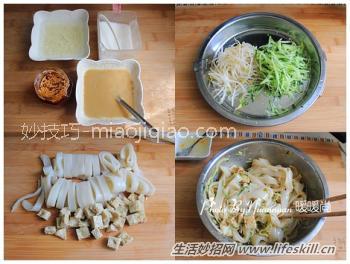 4.取一大点的容器,放入凉皮和面筋,按照口味喜好加入准备好的调味料,调匀即可开吃。