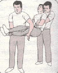 两名救护者,一人站在伤病者的背后将两手从伤病者腋征插入,把伤病者两前臂交叉于胸前,再抓住伤病者的手腕,把伤病者抱在怀里,另一人反身站在伤病者两腿中间将伤病者两腿抬起,两名救护者一前一后地行走。
