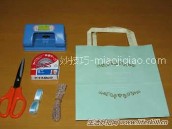 纸袋(稍薄的为好)、彩带、自粘蕾丝边、双面胶带、剪刀、打洞器。