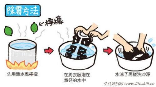 烧一大锅热水,加入几颗柠檬片去煮,再把衣服放入浸泡,待水凉了,再搓洗冲净,就OK啦!